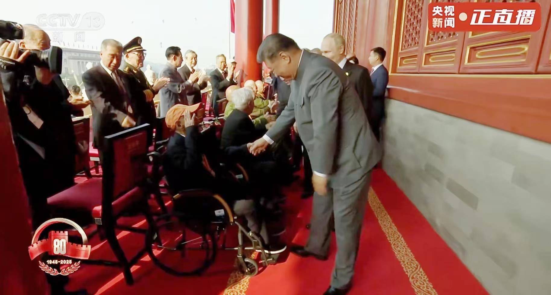 纪念大会开始前,习近平同抗战老战士老同志代表亲切握手,向他们表示崇高敬意。其中,就有来自湖北省宜都市的100岁抗战老兵宋其祥。